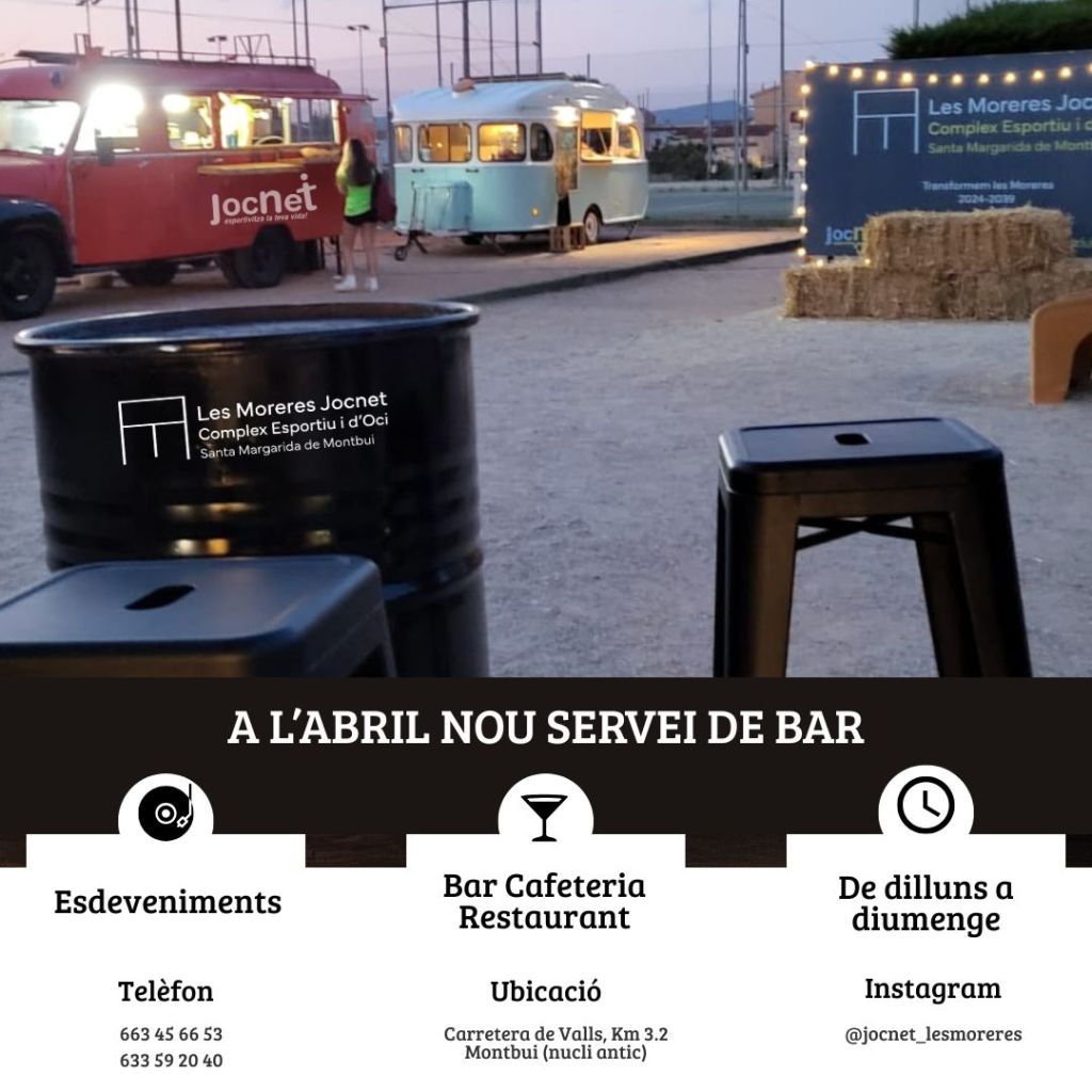 NOU SERVEI DE BAR A MORERES Publicat perJocnet gestió esportiva30/03/2026Publicat enEntrenaments personals A partir d’aquest abril estrenem un nou servei de BAR – Restaurant 🎉☕🍔 Un espai pensat per a tothom, on podràs gaudir en bona companyia 🤝💙 🥪 Cafeteria🍽️ Menjars☀️ Terrassa🎉 Bon ambient 👉 Vine a descobrir-lo i gaudeix de l’experiència Les Moreres! Comparteix això: Share on X (S'obre en una nova finestra) X Comparteix al Facebook (S'obre en una nova finestra) Facebook M'agrada S'està carregant... Relacionats Publicat per Jocnet gestió esportiva Esportivitza la teva vida! Mostra més entrades